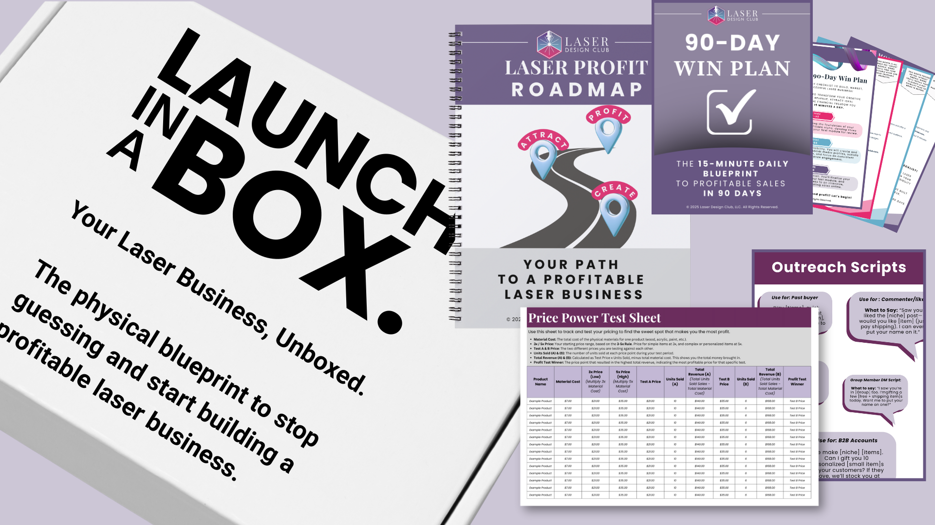 Launch-In-A-Box: Physical copies of our Laser Profit Roadmap Workbook, 90-Day Win Plan Checklist, DM Outreach Scripts and Price Power Test sheet.